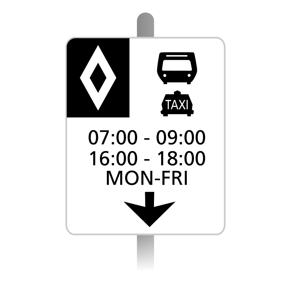 During certain times and days, this lane is reserved for specific types of vehicles (e.g. buses, taxis, bicycles, and vehicles with three or more passengers). | Lane Use Signs | 2024-06-07 11:41:21 | Edit |